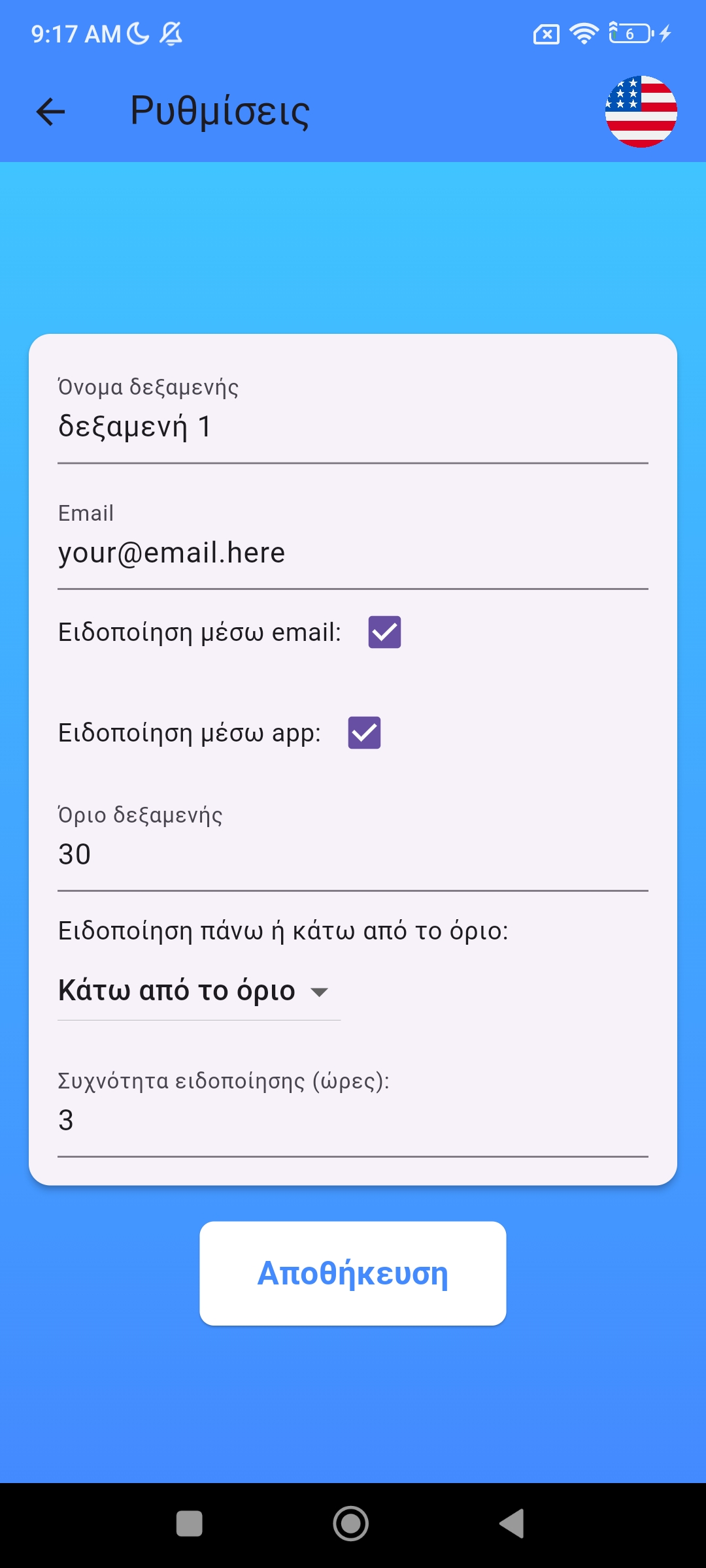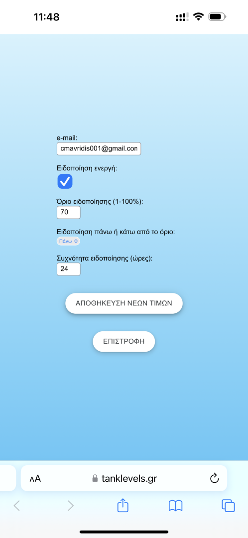 Με την εγκατάσταση έχετε πρόσβαση στην εφαρμογη, για προβολή στάθμης και ρυθμίσεις ειδοποιήσεων.